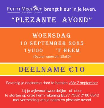 Schrijf in door het betalen van €10 voor 2 september bij je wijkverantwoordelijke of door storting op onze rekening van Ferm Meeuwen BE77 7352 2100 0542 met vermelding van je naam en plezante avond.