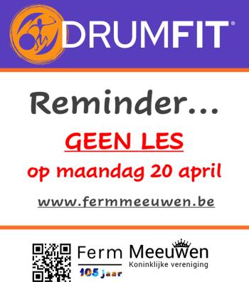 Op maandag 20 april 2026 is er geen Drums fit, wegens afwezigheid van de lesgeefster. We zijn er weer met onze ballen op 27 APRIL.
